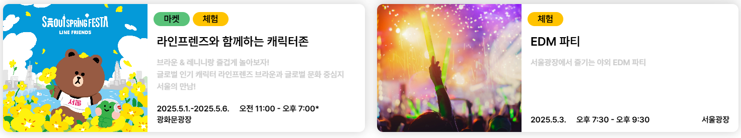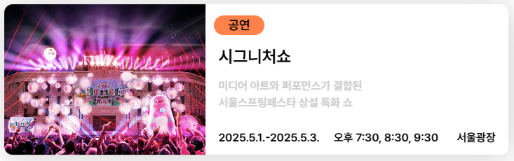 2025.04.30. ~ 2025.05.06. ‘서울스프링페스타’는 K-콘텐츠와 K-컬처의 중심지, 서울에서 펼쳐지는 대표적인 문화·관광 축제입니다.