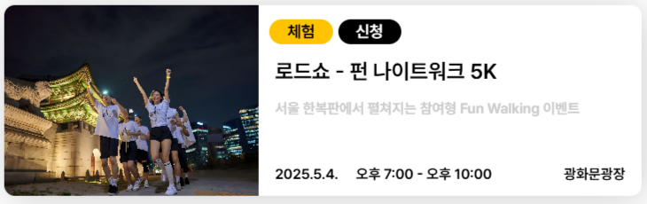 5월 4일에는 광화문광장에서 청와대까지 이어지는 로드쇼 '펀 나이트워크 5K'가 열립니다. 음악이 흐르는 도심 속 ‘펀카’를 따라 2,000명이 함께 걷는 이색 체험으로, 축제 분위기를 만끽할 수 있습니다. 참여 신청은 동마클럽과 클룩에서 가능합니다. 참가비는 15,000원입니다.