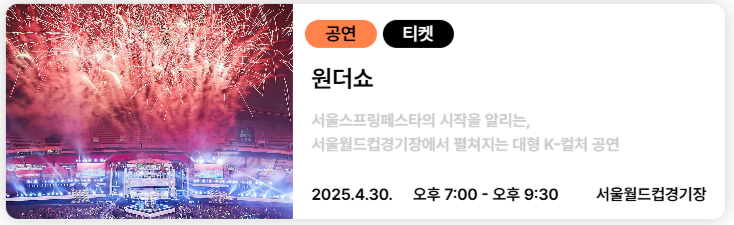 - 원더쇼(WONDER SHOW) : K-POP 아티스트들의 화려한 공연을 즐길 수 있는, 서울페스타의 시작을 알리는 오프닝 콘서트
