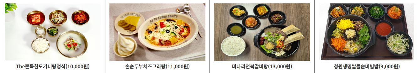 | 국밥 | 대구따로국밥, 횡성한우국밥, 황태국밥, 순대국밥 | 칠곡, 횡성, 홍천, 입장 |