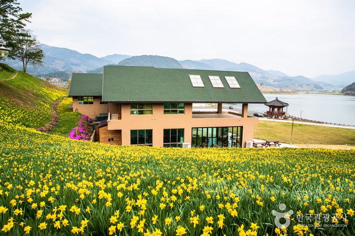 호수가 인접한 지리산치즈랜드, 언덕 위 펼쳐진 노란 수선화와 인스타 사진을 남길 수 있어요. 치즈만들기 체험, 유제품 구매도 가능한 곳이에요.