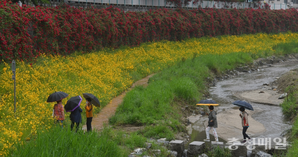 청주 용암동 낙가천을 따라 장미와 금계국이 함께 피어있는 모습을 감상할 수 있어요. 갓길에 주차 후 잠시 감상을 위해 산책을 해보는 건 어떠세요.