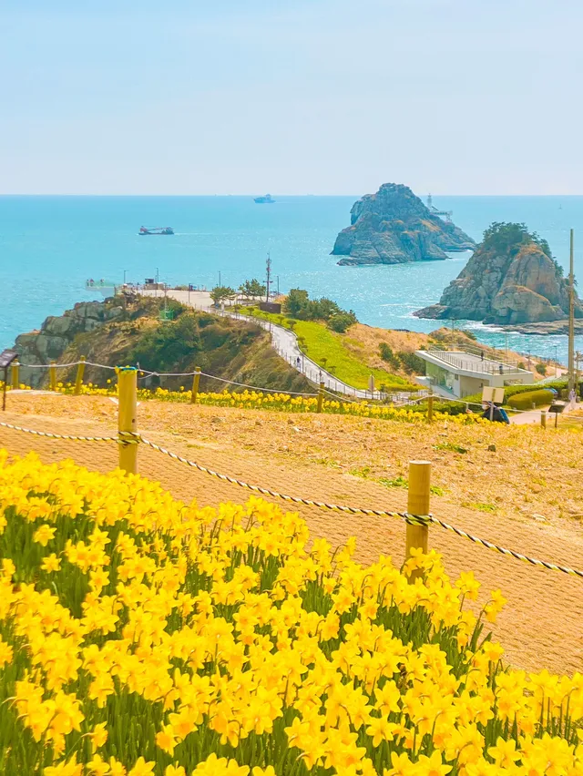 탁 트인 바다와 노란 수선화와 함께 산책하기 좋은 부산의 관광명소, 유채꽃, 벚꽃도 피어 있어요.