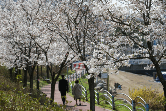 온양온천역 철도 노선을 따라 걷는 벚꽃길로 자전거 도로와 산책길로 이어진 1km 남짓의 벚꽃길은 터널로 만들어져 감탄사를 만드는데 벚꽃 터널을 걸으며 가벼운 산책을 하기에는 최적의 장소예요.
