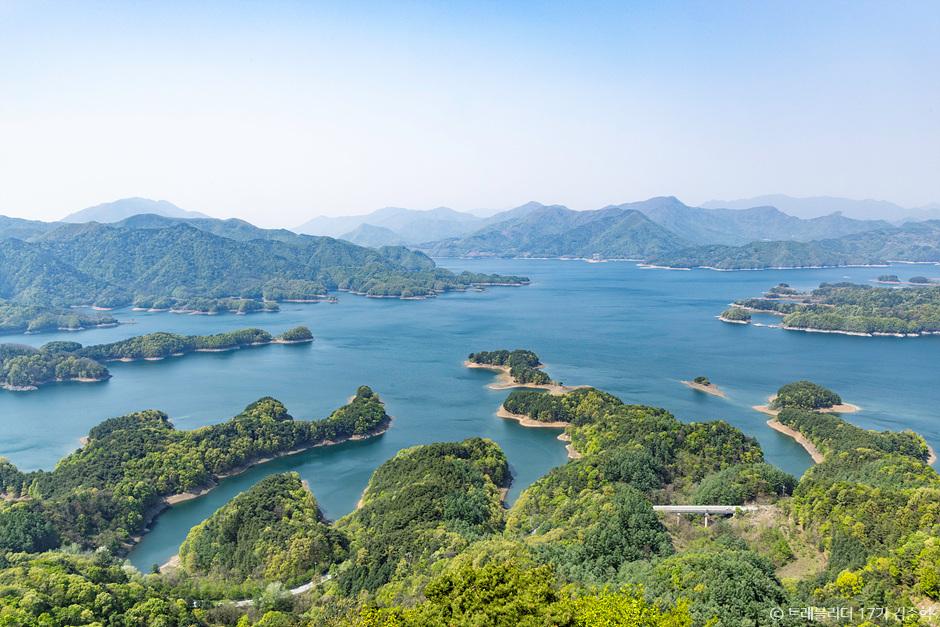 정상에서는 구불구불한 산세와 푸른 호수가 어우러진 절경이 펼쳐지며, 일몰 타임에는 붉은 노을이 더해져 감동을 선사합니다.