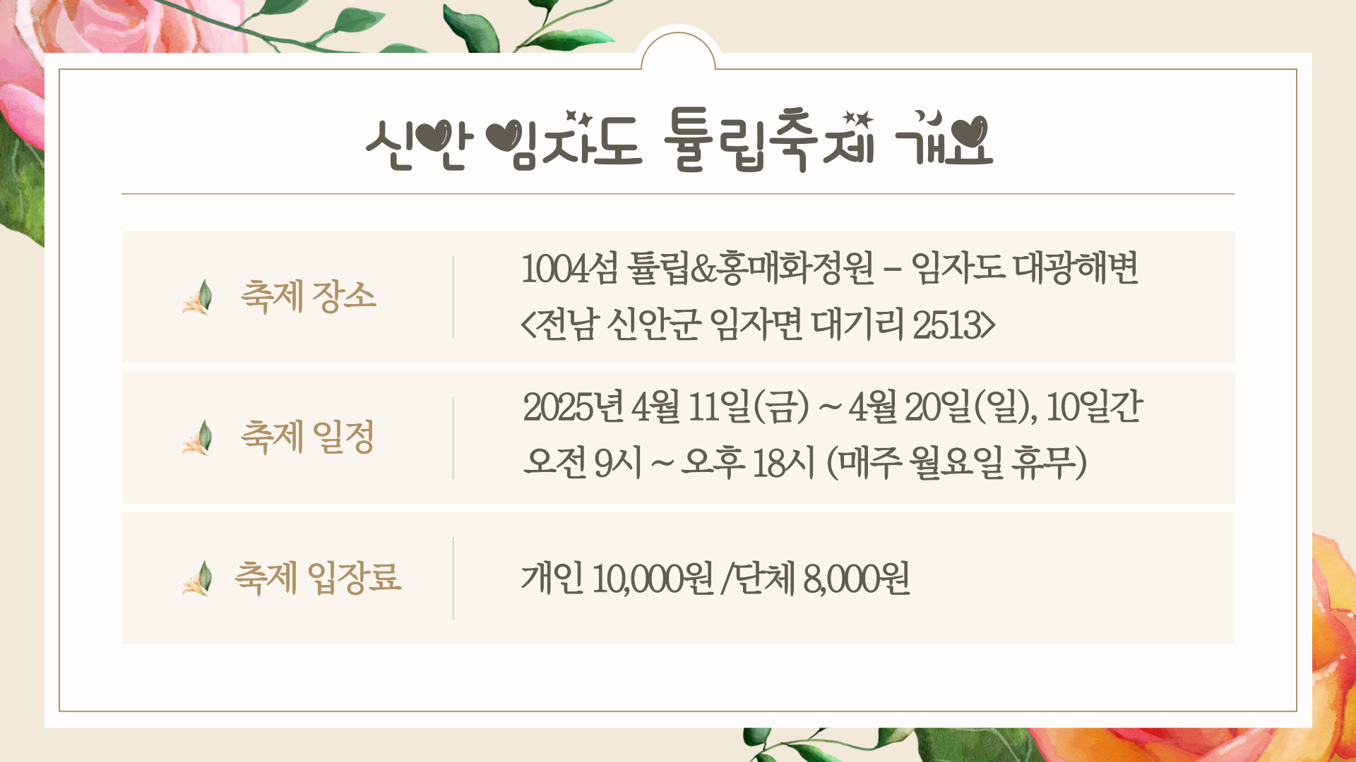 - 개최 장소: 전남 신안군 임자도 1004 섬 튤립&홍매화정원 대광해변 일원