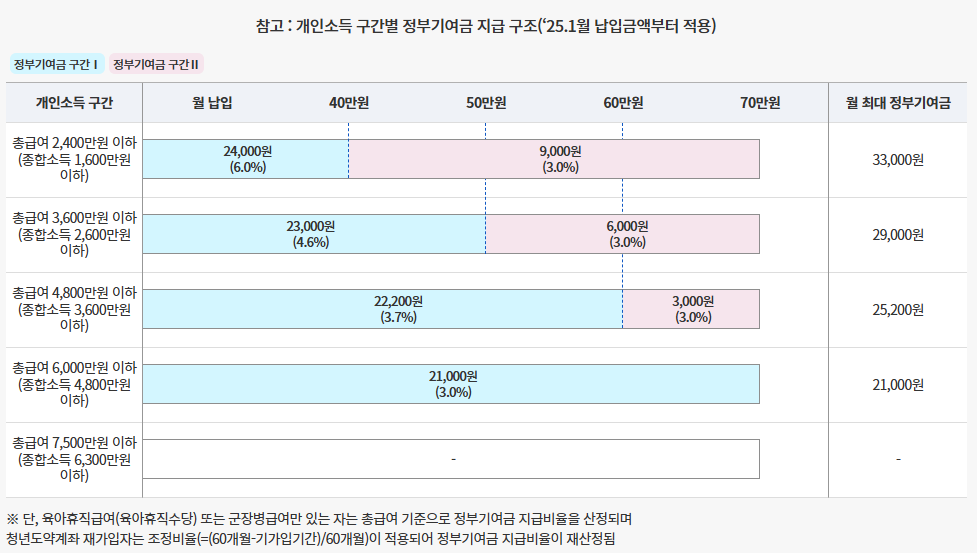 - 정부기여금: 납입금액과 소득 구간에 따라 매달 최대 3.3만 원 지원